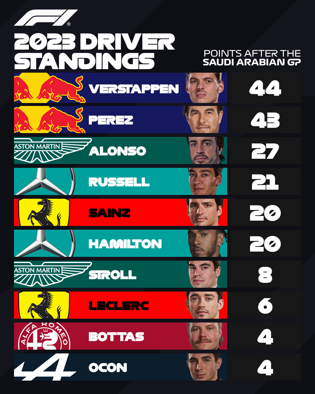Dua pekan setelah menang di Bahrain, Verstappen mengalami kerusakan driveshaft saat babak kualifikasi di Sirkuit Jeddah Corniche dan harus start dari P15. Namun, juara dunia dua kali itu tak kesulitan menemukan jalan dan membutuhkan hanya 24 putaran untuk naik ke tiga besar.