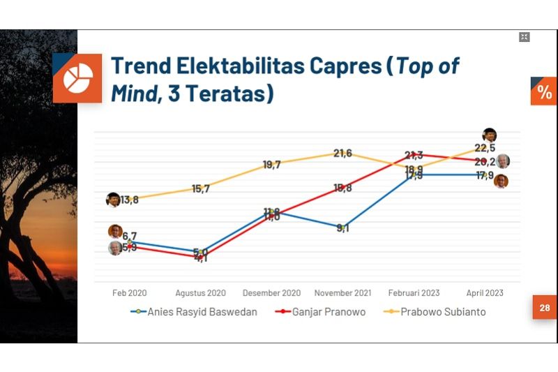 November 2021, elektabilitas Prabowo 21,6 persen, Februari 2023 turun sedikit ke 21,3 persen. Namun April, elektabilitas Prabowo rebound menjadi 22,5 persen, unggul dari Ganjar (20,2 persen) dan Anies Baswedan (17,9 persen).